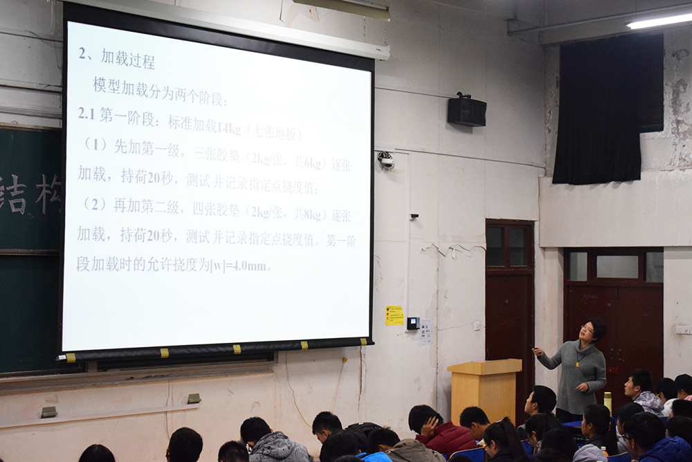 潘老师结合自己多年作为带队教师参加全国大学生结构设计竞赛的经历和丰富经验,分析了历届大赛的赛题、各高校获奖情况分析、赛前准备、学校组织相关比赛情况等,并对以后的赛题进行了展望。最后,潘老师还就西安理工大学第五届大学生结构设计竞赛的赛题进行了解读,并与学生进行了互动。潘老师的讲座深入浅出、通俗易懂,不时赢得了热烈的掌声。