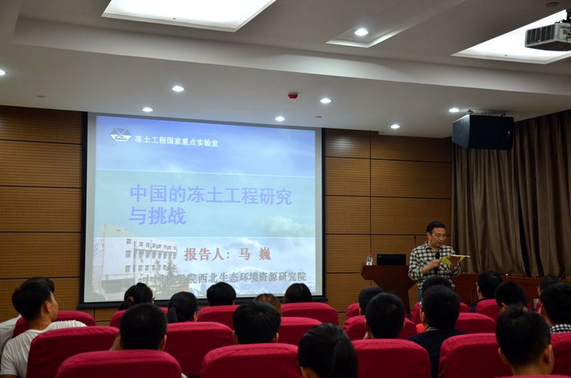 报告中,马巍教授就中国冻土的分布及冻害特征和中国冻土工程研究进展做了详细介绍,并深入浅出的介绍了我国将来在冻土方面所面临的挑战及青藏铁路建设中遇到的技术难题和解决方案,精彩的讲解不时赢得阵阵掌声。报告会结束后,马教授与参会的师生展开了积极的学术讨论,并详细解答了现场师生提出的各种问题。整场报告会学术气氛浓厚,反响热烈。