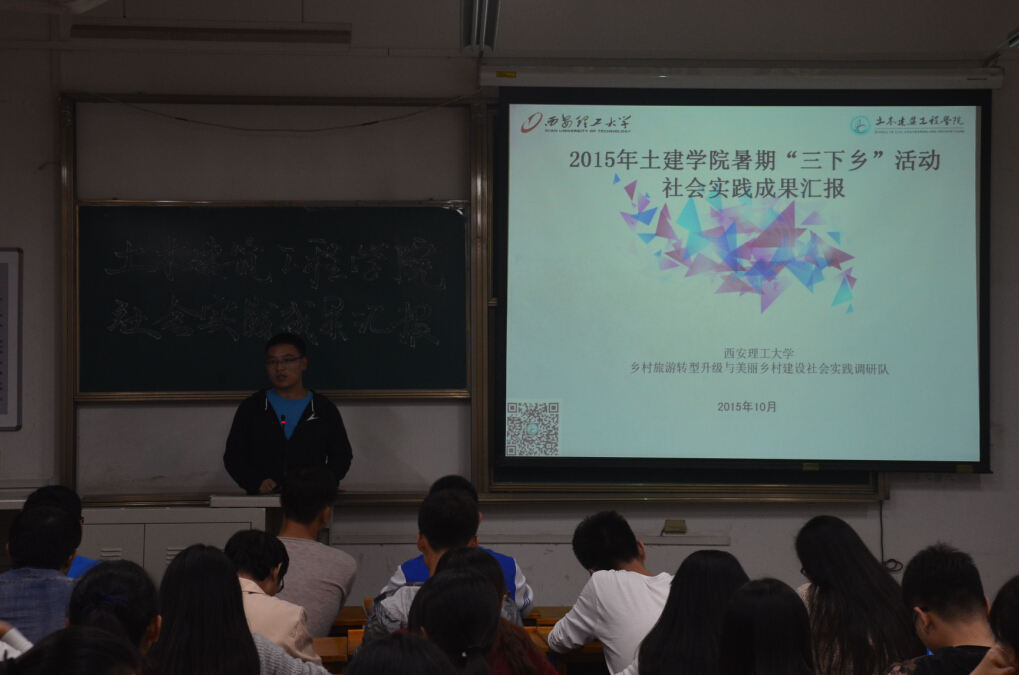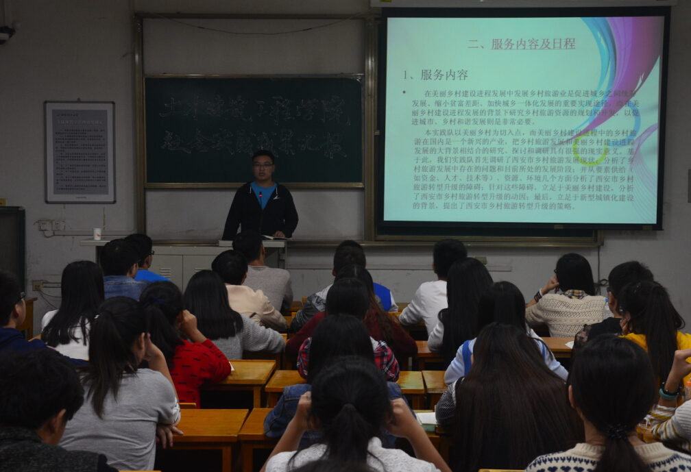 经过精心的筹备和周密的策划,我院暑期社会实践队组建于2015年6月底,调研的题目是“乡村旅游转型升级与美丽乡村建设”。在交流过程中,队长邹家俊通过视频、PPT等形式图文并茂地展示了社会实践期间的实践成果,同时其他成员交流了实践经验,分享了实践感受。在本次“三下乡”社会实践活动中,实践队汇集了学院城乡规划、土木工程、工程管理等专业的学生,充分发挥其专业优势和所学到的知识,精心策划,周密安排,使得此次活动圆满结束。并且此次社会实践活动成果颇为丰富,得到了包括国家级、省级、市级等众多媒体的报道,形成了1篇高质量的调研报告。