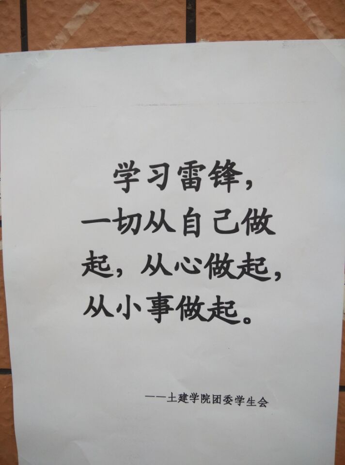 贴标语、掀热潮——宣传雷锋事迹。3月5日早上,我院团委组织青年团员制作了学习雷锋精神的宣传标语,张贴在餐厅前、宣传栏等地,营造浓厚的学雷锋氛围。