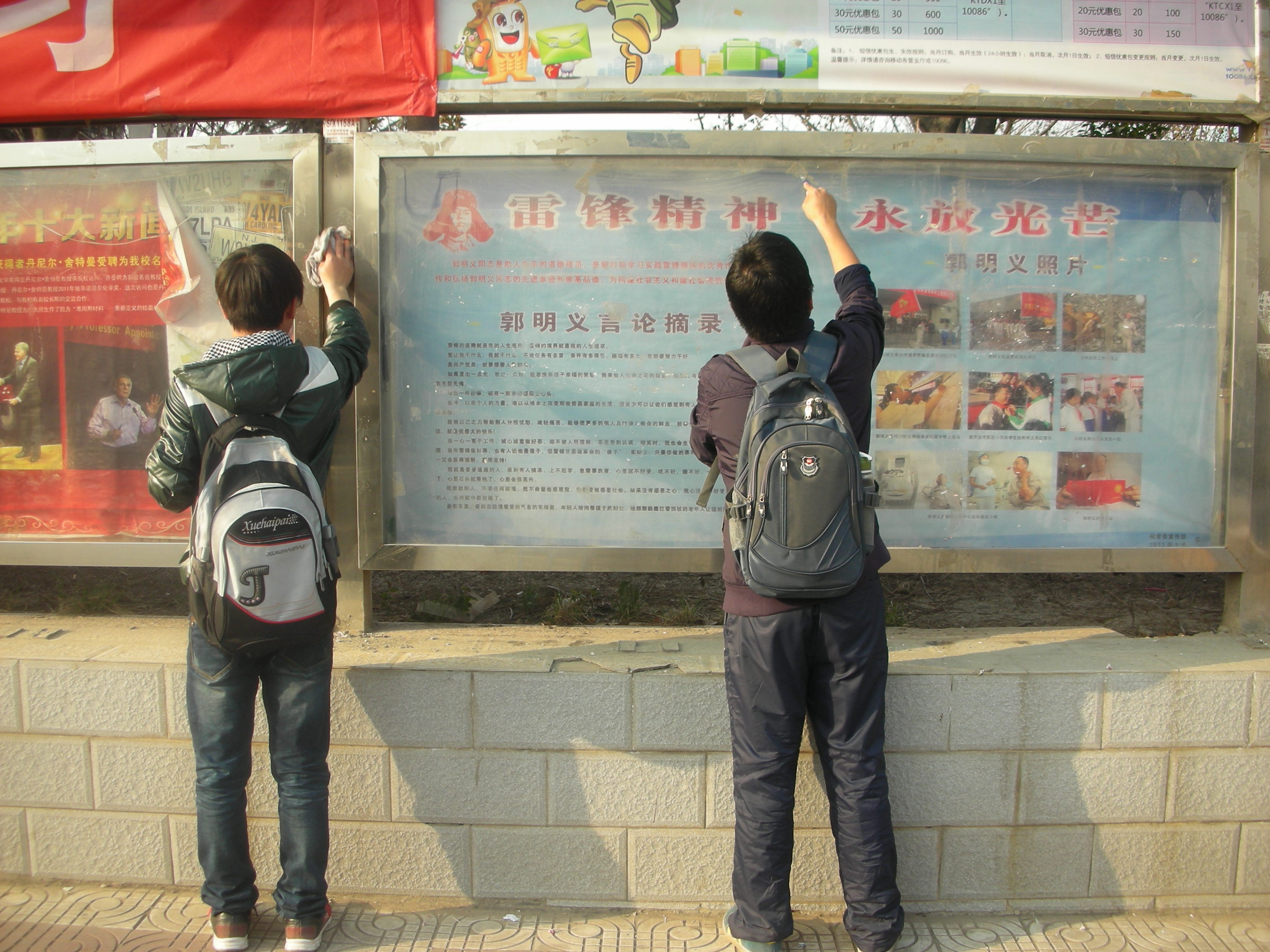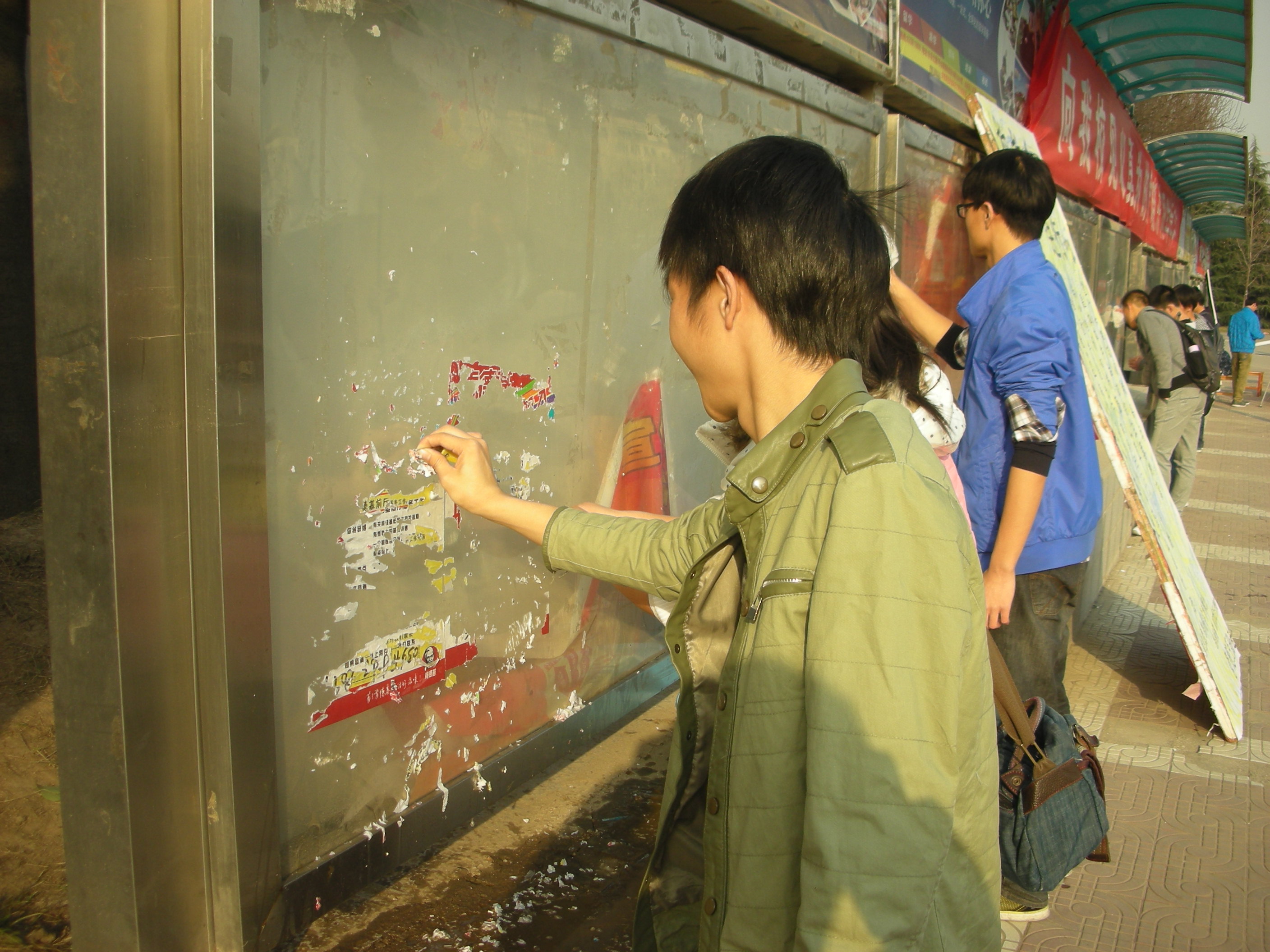尽管天气还是有点微凉,但志愿者们热情十分高涨。他们拿着小刀、刷子、脸盆和抹布等在校园清理着小广告。清理活动以小组分散进行的形式展开,大家积极参与,互相配合,分工明确,现场井然有序。经过二个小时的努力,学校宣传栏上的各类广告基本清除干净,校园的环境大大改善。校园里人来人往,很多同学或投来赞许的目光,或主动加入志愿者队伍,我们这些学志愿者成为了校园一道最亮丽的风景线。我们不仅做着好事同时我们也在用我们的行动和力量感染着身边的人,为校园添加了一缕暖色。