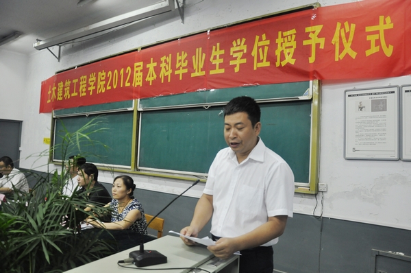 bat365中文官方网站2012届本科生毕业典礼暨学位授予仪式于7月4日早晨9:30在教6-401举行。参加仪式的嘉宾及领导有:杰出校友代表、西安高新建设监理有限责任公司董事长范中东先生,院党委书记、博士生导师师俊平教授,院长、博士生导师刘云贺教授,副院长范留明教授,院党委副书记李红英老师、院长助理赵钦老师。