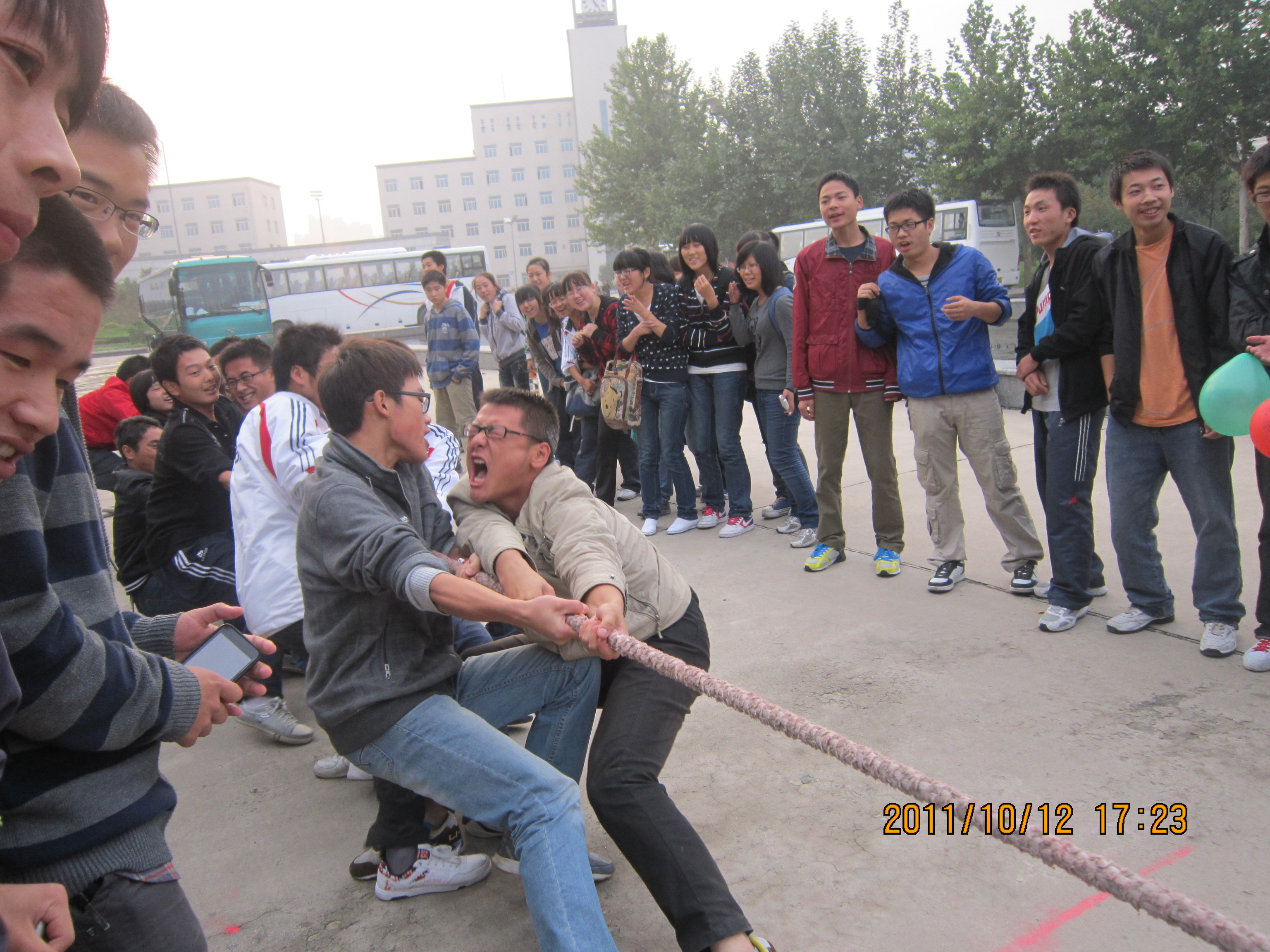 本次活动分初赛、决赛两部分。在10月10日的初赛中,土木学院2011级各班均积极参加了比赛,经过激烈的角逐,最终有五个班级进入了决赛。在10月12日的决赛中,各班级的同学们更是怀着更加高涨的热情参与进比赛中,无论是参赛选手,还是啦啦队员,大家都竭尽全力做到最好。在最后冠军争夺中,土木111和工管111更是给观众带来的了一场狼与虎的较量,大家虽筋疲力尽,却仍在坚持。最终,工管111以一局之胜夺得了本次友谊拔河赛的冠军。