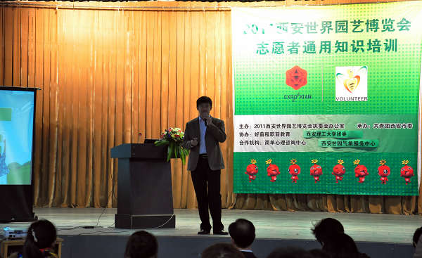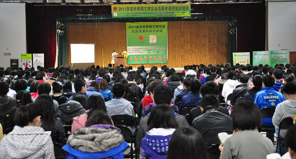 2011西安世界园艺博览会志愿者通用知识培训会4月3日在我校曲江校区大学生活动中心举行,首批入园工作的我校500名志愿者接受了培训,标志着我校世园会志愿者培训工作已全面启动。