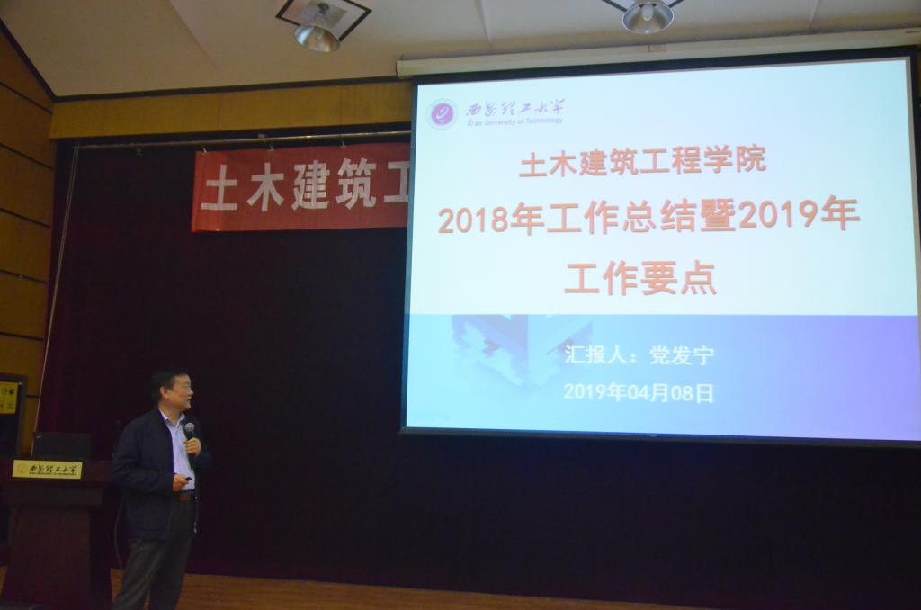 首先,院长党发宁分别从招生就业工作、人才引进与培育、本科教学工作、学科与研究生、科研工作、学生工作、党建工作七个方面对2018年度学院的工作成果进行了总结,也指出了现阶段制约学院发展的问题与不足,其中特别强调了日常本科教学工作中的问题。他讲到教师是第一身份,教学是第一工作,并且号召全院教师不仅将教学当成工作,而且要当成事业。