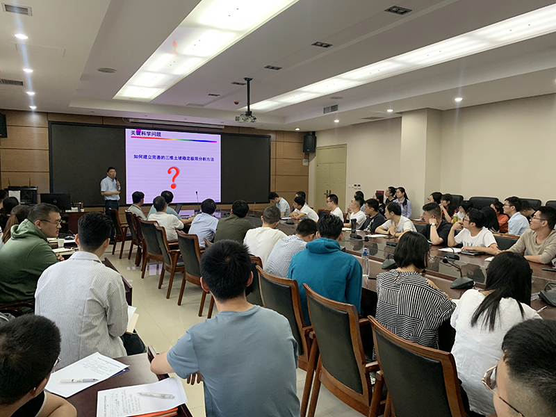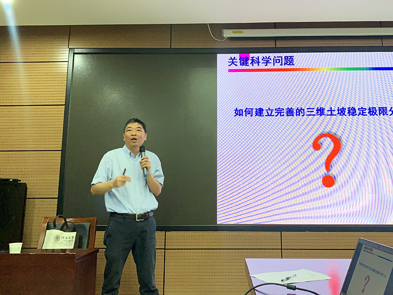 报告会上,高玉峰教授结合土质边坡破坏工程案例,介绍了现有土坡稳定极限分析方法的不足,阐述了土质边坡的坡面破坏、坡脚破坏以及坡底破坏等三种转动破坏机制,并详细讲解了三维土质边坡临界高度优化方法及其三维土坡稳定极限分析方法。最后,还介绍了水位下降、地震荷载作用等多因素对三维土质边坡稳定性的影响。