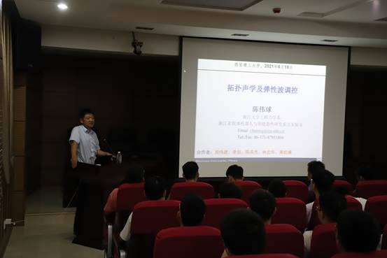 应我院邀请,浙江大学陈伟球教授于2021年6月18日到我校进行学术交流,做了题为“拓扑声学及弹性波调控”的学术报告。拓扑声学是近年来物理、器件、材料等多个学科的研究热点,其奇异的波动特性(如单向传播、缺陷免疫)都源自于结构的拓扑对称特征。报告介绍了他们课题组在可调拓扑声学方面的前沿性研究工作,通过构建合适的单元可以打破空间对称性,实现量子谷霍尔效应,并进行了实验验证。陈伟球教授的报告精彩生动,内容丰富,深入浅出地介绍了拓扑声学发展的历程和当前所面临的挑战,报告赢得了在场师生的热烈掌声。报告会由胡义锋副院长主持。