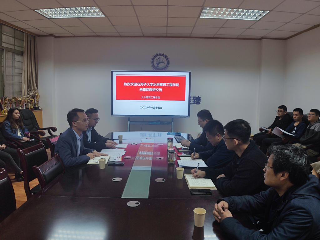 2021年10月17日下午,石河子大学水利建筑工程学院副院长袁康一行来我院开展调研交流活动。学院副院长郭宏超、实验中心主任王振山、学工办副主任刘蓬晨及相关专业的研究生参加了座谈。活动由学院党委副书记兼副院长王宗强主持。