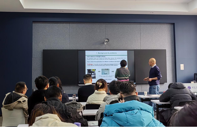 报告会上,马利锋教授针对经典塑性理论中忽略了静水压力对塑性变形行为影响的不足出发,分享了从热力学第一、第二定律和最大能量耗散率原理的基本理论推出新的弹塑性力学框架的详细过程,导出了更为普遍的增量弹塑性本构方程,并提出了一系列合理的屈服准则,解释了某些金属、多孔材料、颗粒材料和土工材料的破坏行为。报告讨论气氛积极热烈,马教授耐心细致的回答了学院教师和研究生提出的问题,同时鼓励大家秉持求索信念,保持科研热情。