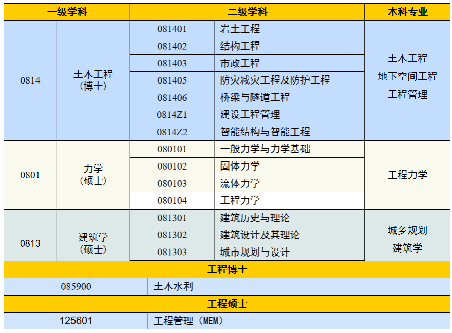学院现有土木工程博士后流动站、土木工程一级学科博士授权点、土木水利专业学位博士授权点、力学一级学科硕士授权点、建筑学一级学科硕士授权点、工程管理(MEM)硕士专业学位授权点,如下表所示。