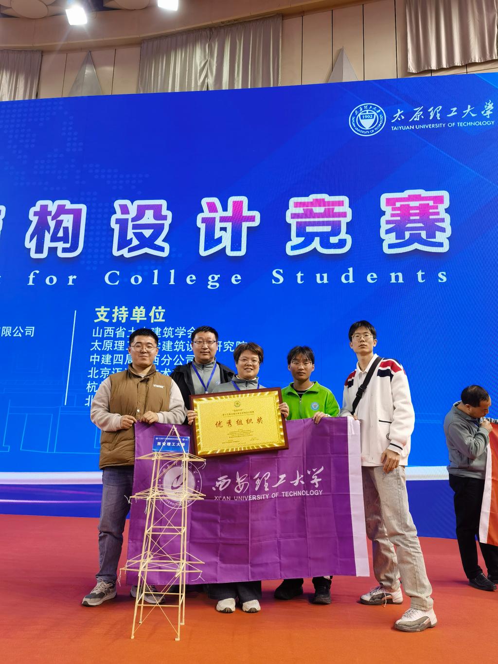 本次大赛赛题为“三重木塔结构模型设计与制作”,以我国现存唯一的纯木构楼阁式古塔——应县木塔为构思设计此次赛题,赛题模型以三重木塔结构为题,要求参赛队伍使用美工刀、钢尺、三角板、胶水等工具,利用组委会提供的竹条和竹片现场制作一座足够轻盈的带挑檐加载点的木塔结构模型,并针对竖向荷载、扭转荷载及水平荷载等多种荷载工况下的空间结构进行受力分析和加载测试。经过16小时的现场模型制作、陈述答辩、模型加载等环节激烈比拼,西安理工大学代表队以优秀表现完成比赛。