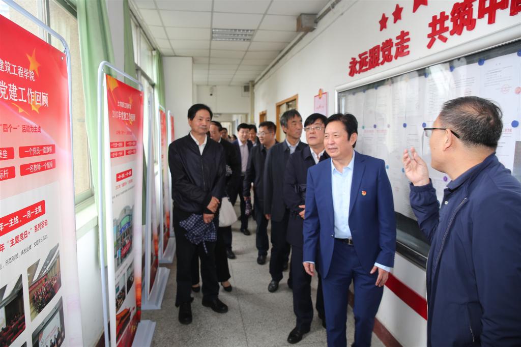 王青耀同与会人员首先参观了学院党建文化长廊,展示学院近两年党建活动内容及成效,介绍了学院“抓党建就是抓发展,抓发展必须抓党建”的工作理念,“主题党日+”系列活动的党员实践教育模式以及“一年一主线,一月一主题”的工作思路。随后,与会人员参观了党建活动室,查阅了学院“不忘初心、牢记使命”主题教育以来的学习资料和阶段成效。