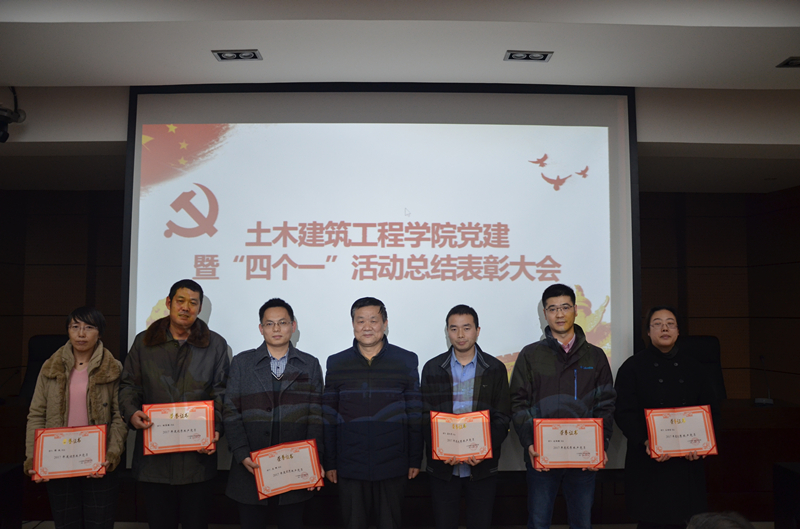 首先,院党委副书记、副院长赵钦宣读了学院开展“四个一”活动以来,先进支部和个人的《表彰决定》。“四个一”暨“一名教师一个楷模、一个党员一面旗帜、一名干部一个标杆、一个支部一座堡垒”。在全年的活动中,各支部积极组织,全院教工积极参与,经学院党委对各支部年底工作的汇报考核,最终决定授予工程管理系党支部、工程力学系党支部、土木工程系党支部“先进党支部”荣誉称号,姜仁贵等6名同志“优秀共产党员”荣誉称号,王砚等6名同志“先进党务工作者”荣誉称号,潘秀珍等5名同志“师德先进个人”荣誉称号。学院班子成员、院工会主席等为获得表彰荣誉的支部和个人颁发奖牌和荣誉证书。