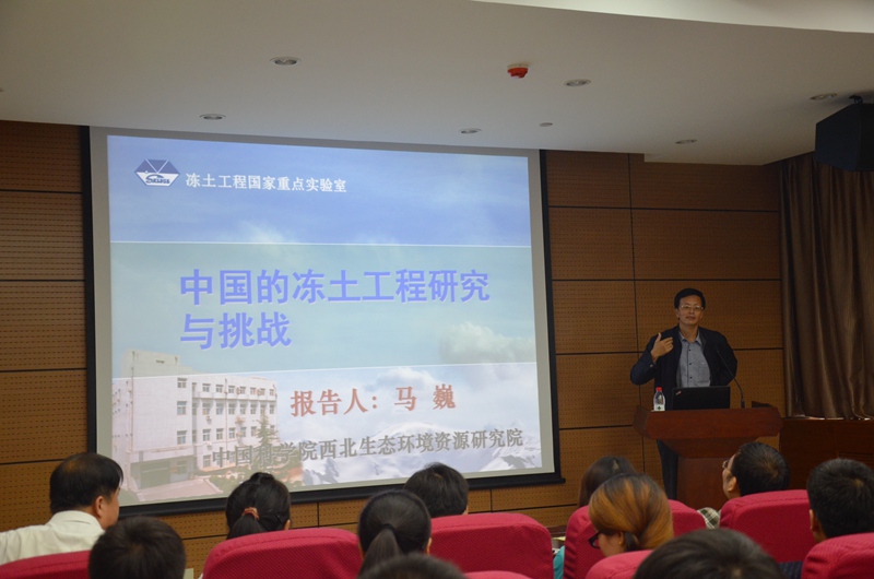 报告中,马巍教授就中国冻土的分布及冻害特征和中国冻土工程研究进展做了详细介绍,并深入浅出的介绍了我国将来在冻土方面所面临的挑战及青藏铁路建设中遇到的技术难题和解决方案,精彩的讲解不时赢得阵阵掌声。报告会结束后,马教授与参会的师生展开了积极的学术讨论,并详细解答了现场师生提出的各种问题。整场报告会学术气氛浓厚,反响热烈。