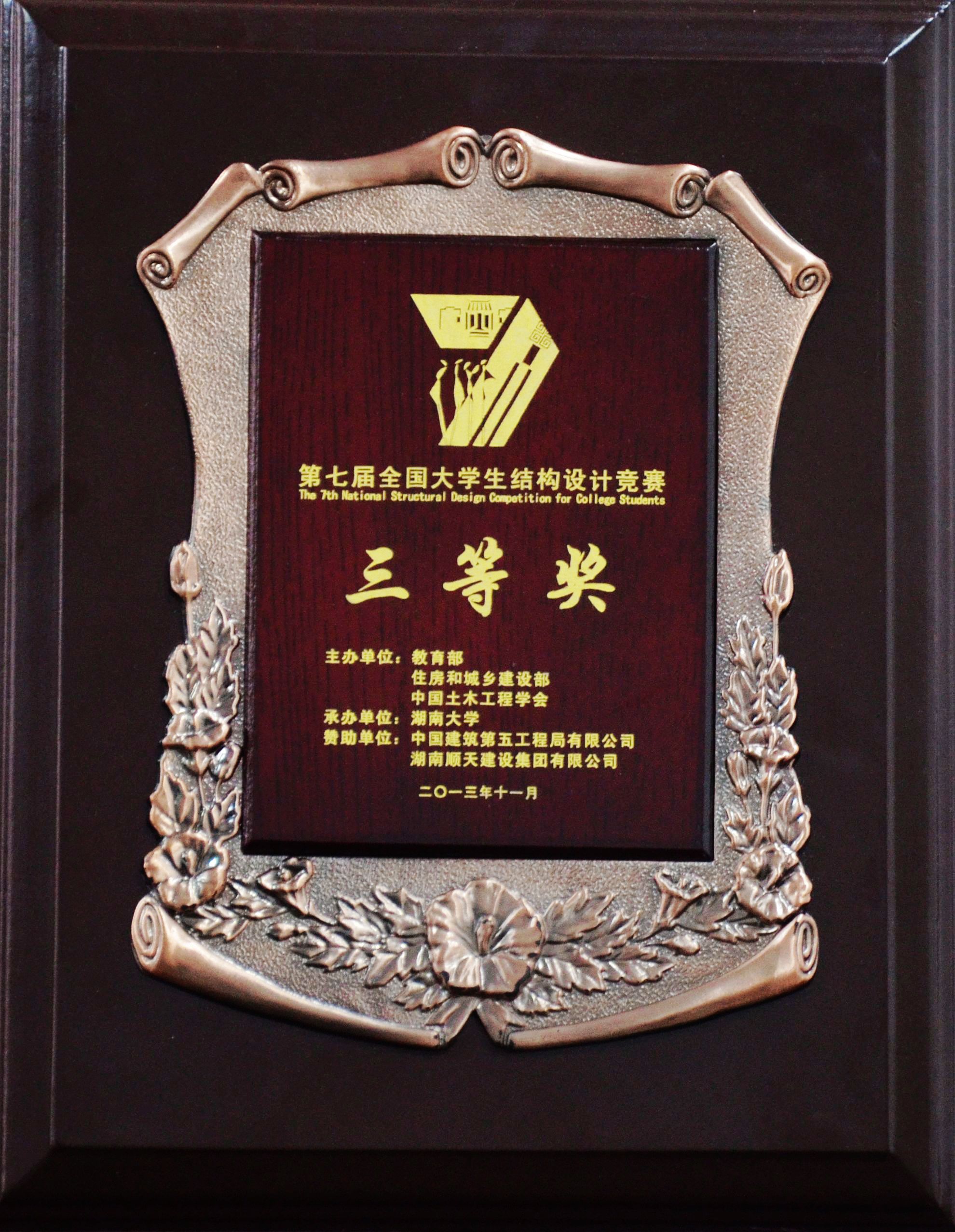 2013年11月27日至30日,第七届全国大学生结构设计竞赛在湖南大学举行,来自上海交通大学、清华大学、浙江大学、同济大学、澳门大学、美国南加州大学、西安理工大学等96所中外高校的近百支代表队参加大赛。我院3名学生代表学校组队参赛,获得本次大赛三等奖。