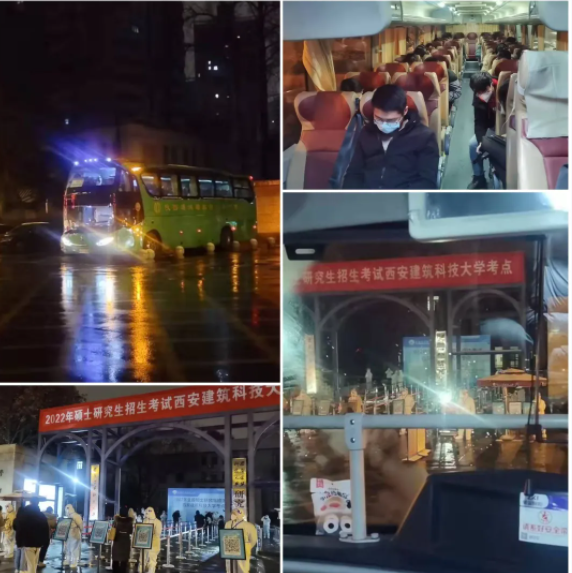 学院研考考生中,涉及金花校区前往曲江校区考场的考生101人,曲江校区前往金花校区考场的考生5人,外校考场的考生48人,分散在西安建筑科技大学雁塔校区、西安交通大学城市学院、西安交通大学雁塔校区、西安体育学院、西北大学桃园校区等多个考点。为降低和减少由于人员流动带来的新冠病毒传染风险,解决考生出行难题,学院按照学校要求,提前谋划、精心安排,最终圆满完成了所有考生的送考、接考任务!