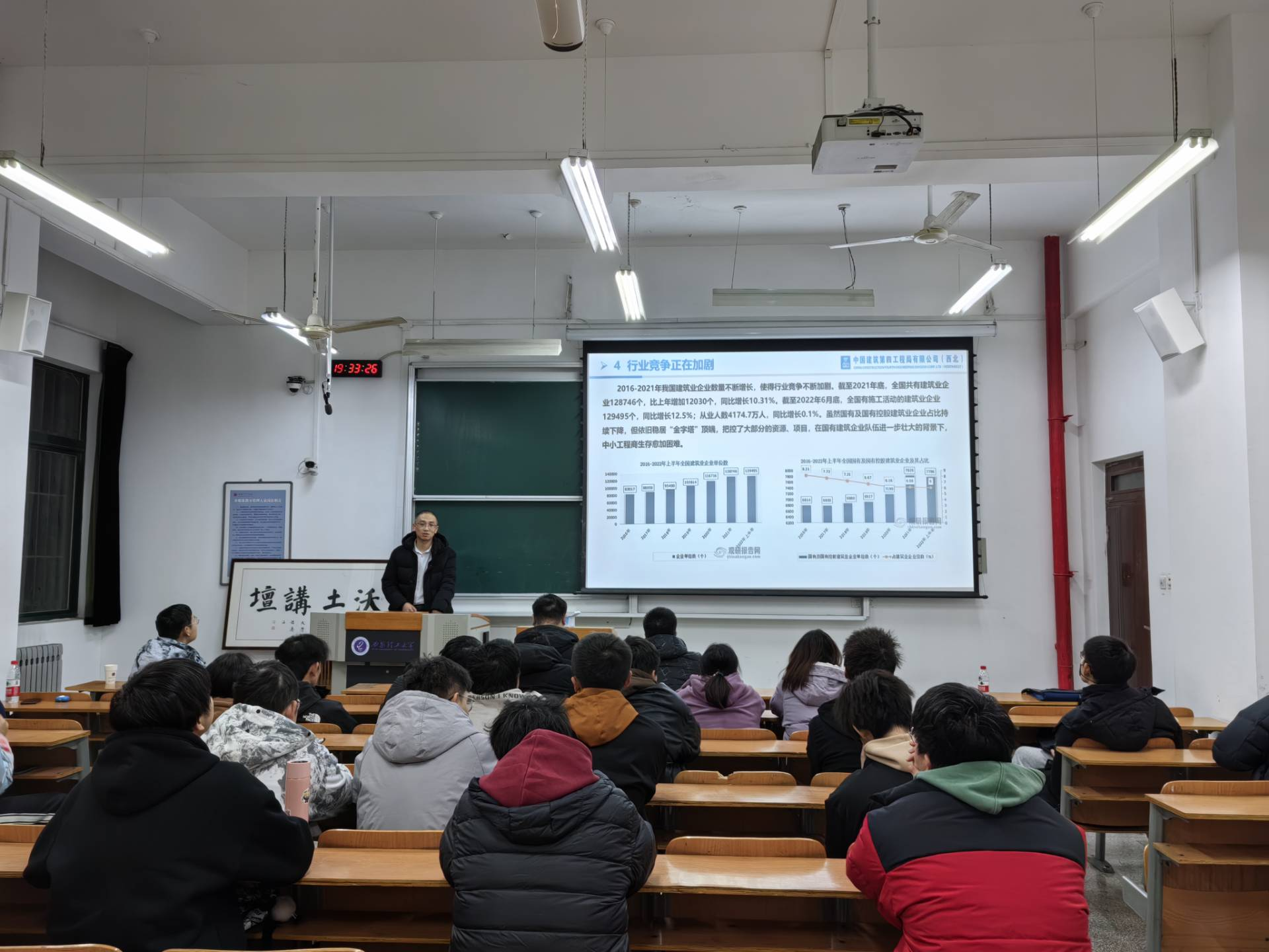曹铖以“建筑行业发展趋势及应届毕业生职业规划”为题,从全国建筑行业基本情况出发,结合具体项目案例及新兴技术应用,剖析了建筑行业未来的发展趋势。同时,他结合自身经历详细介绍了职业发展的各个阶段和不同通道,鼓励同学们注重提升综合素质和沟通协调能力,并与现场同学进行互动交流,为同学们答疑解惑。
