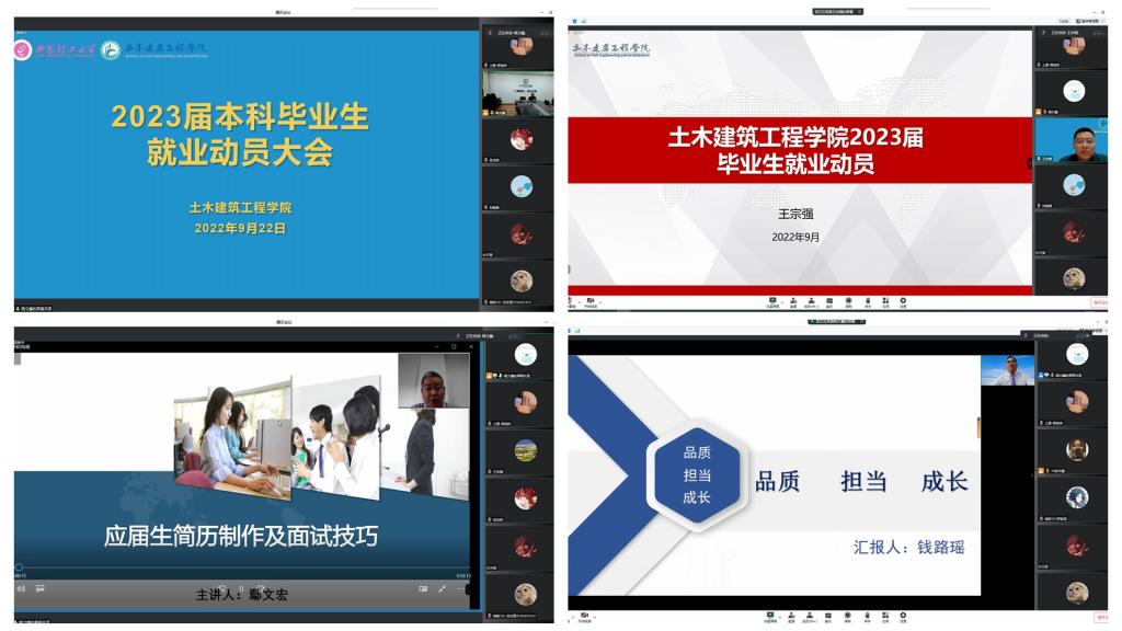 会上,赵钦作动员讲话,她希望同学们树立正确的就业观,深刻认识当前的就业形势,树立信心、早做准备、主动出击,尽快找到自己心仪的工作。王宗强结合学院毕业生就业实际,详细分析了近几年学院总体就业情况,给出了自己的建议并结合相关案例提醒注意就业安全,希望同学们抢抓当前招聘黄金季,综合考虑自身条件和社会需求,实现高质量就业。鄢文宏作了“应届生简历制作及面试技巧”的主题报告,帮助毕业生提升求职面试技巧。校友代表、中建八局西北公司的冯权、钱璐瑶分享了自己在工作岗位上的成长经历和经验,勉励同学们牢记“祖国 荣誉 责任”的校训,立足专业,到祖国最需要的地方建功立业。