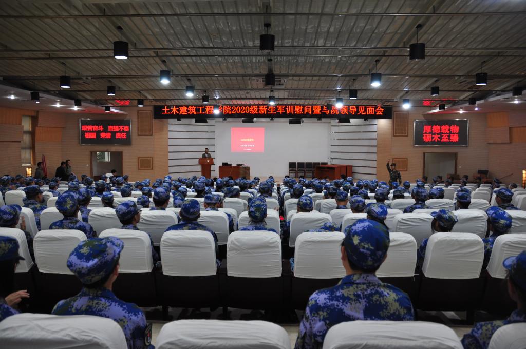 首先,党发宁院长向2020级学生详细介绍了学校、学院的历史沿革和学院总体情况;随后赵钦党委副书记介绍了学生管理制度相关情况并进行了新生入学教育;陕西建工控股集团有限公司党委组织部、人力资源部部长韩军锋介绍了陕西建工的发展情况,鼓励同学们有目标、有方向地学习,不断增强专业本领;之后,王青耀书记向承训官兵表达了感谢、向进入学院学习的同学们表达了祝贺,并提出了敦敦教诲和殷切希望。最后,院领导为军训教官和新生送上了慰问品。